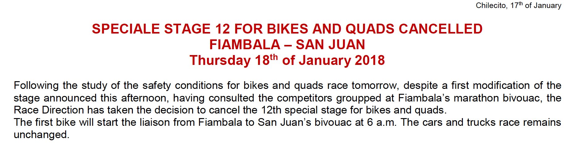 Etapa a XII-a programată joi între oraşele argentiniene Chilecito şi San Juan a fost anulată de organizatori la secţiunile moto şi quad după ce piloţii de motociclete şi quads au refuzat să ia startul după vehiculele de la secţiunile auto şi campioane, ca urmare modificării traseului din cauza condiţiilor meteorologice nefavorabile prevăzute pentru joi, după cum au explicat şefii echipelor participante.